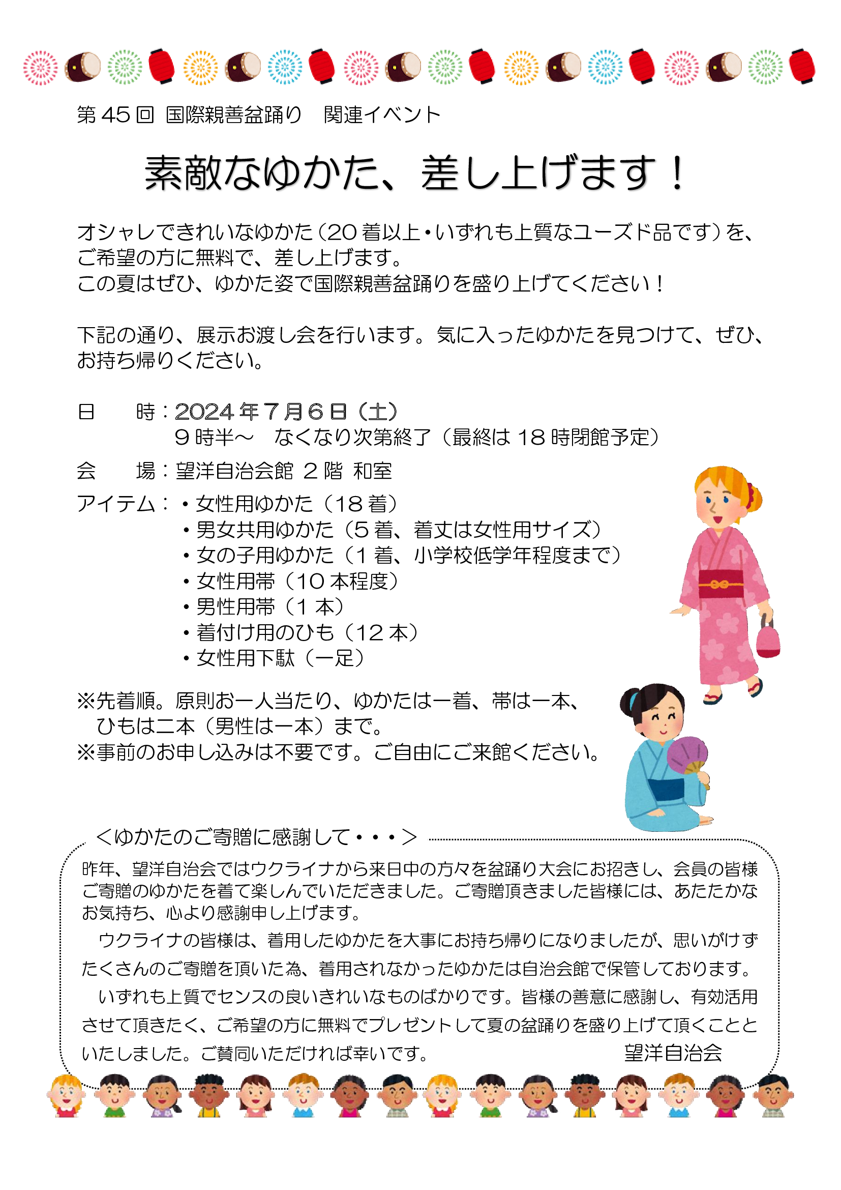 - 2024/06/01 プレイベント「素敵なゆかた、差し上げます」7月6日(土)9時半~、自治会館2階にて