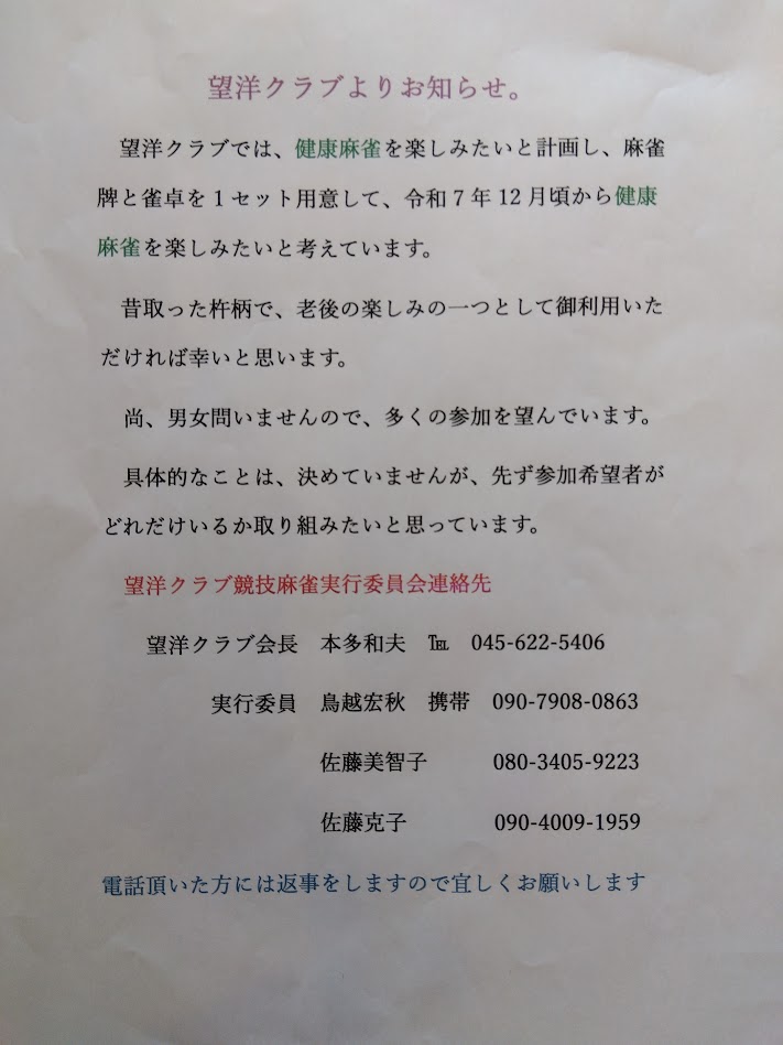 「健康麻雀」参加者募集中! 主催:望洋クラブ(シニアの会)